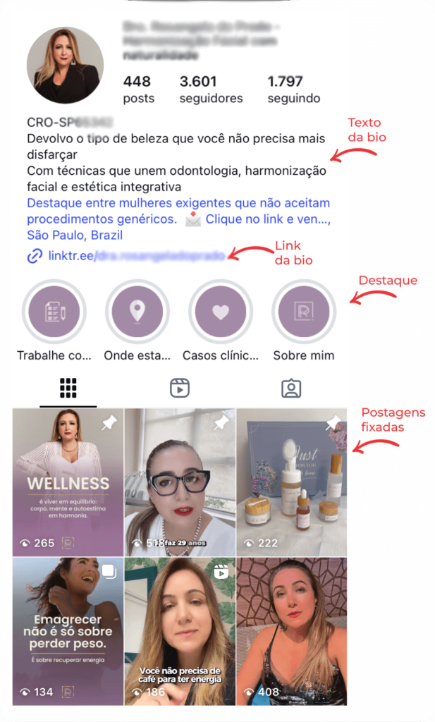 Avaliação da foto de perfil, nome de usuário, bio, destaques e feed.